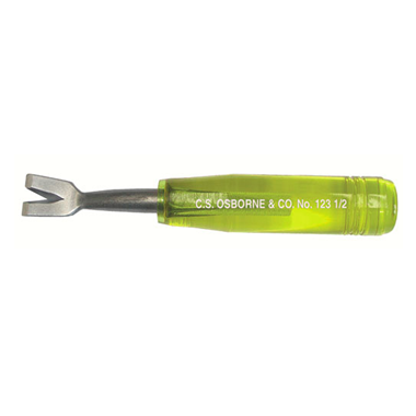 Combined Ripping tool and tack puller. Amber plastic handle. Polished blade.